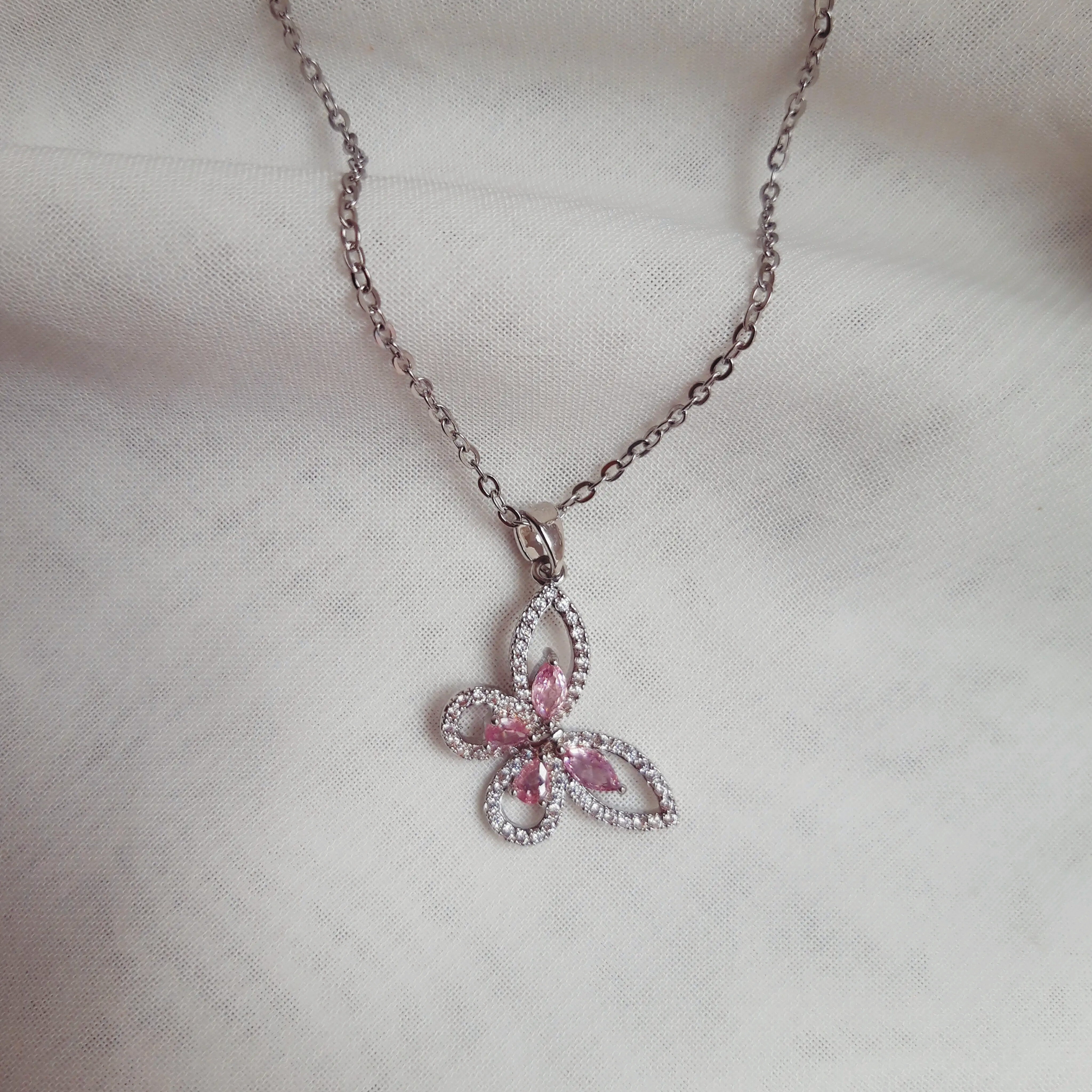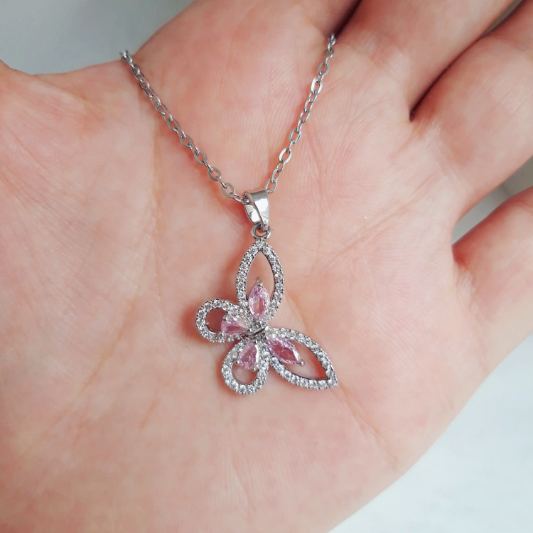 گردنبند طرح پروانه نگیندار از استیل نقرهای رنگ ثابت و ضدحساسیت گزینهی فوقالعاده برای استایل شیک و روزمره دخترانه میباشد.