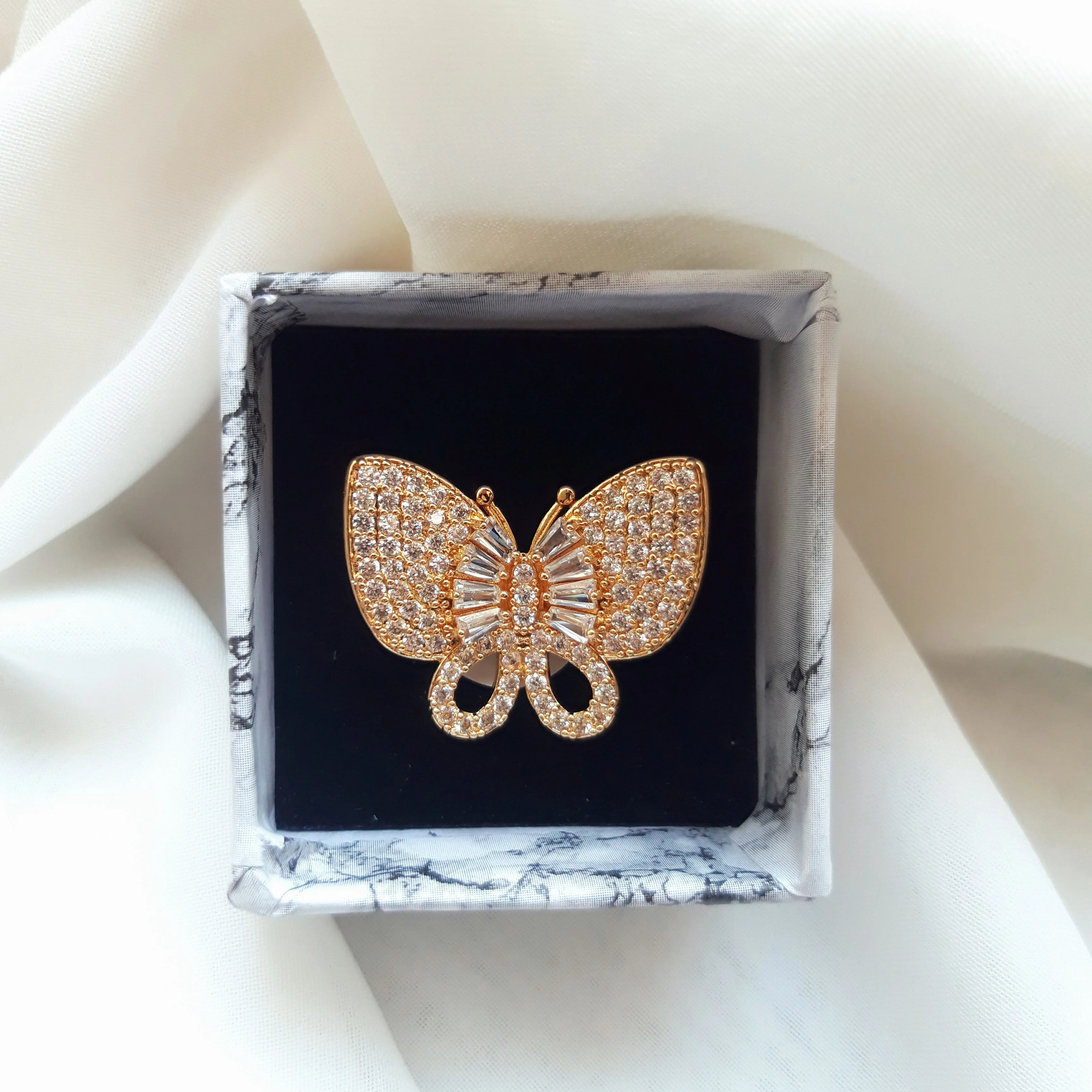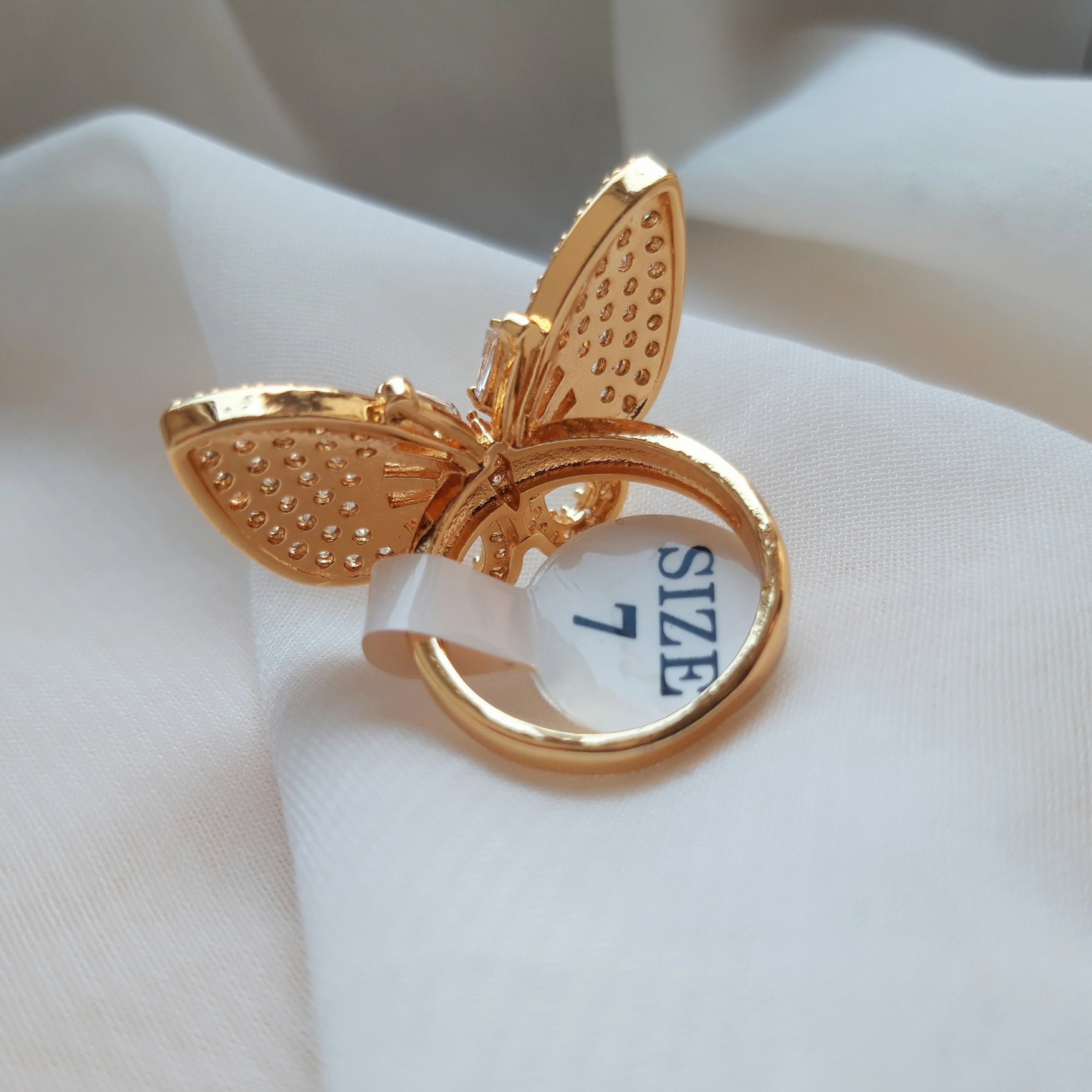 انگشتر پروانه سایز ۷، از جنس استیل طلایی رنگثابت و ضدحساسیت، مناسب استایل شیک و مجلسی زنانه میباشد.